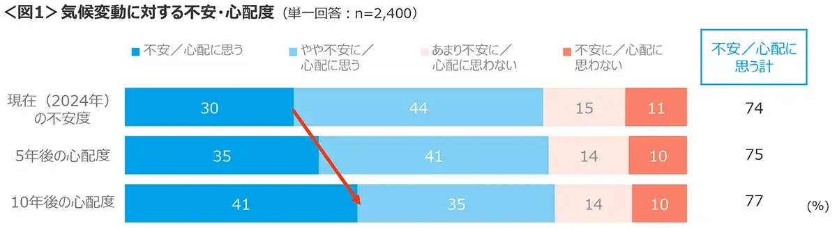 現在の気候変動に対し「不安に思う(TOP BOX)」は30%、「やや不安に思う」44%と合わせて74%は”不安感”を持っている。今から5年先と10年先の気候変動への「心配に思う(TOP BOX)」の割合は、5年先で35%、10年先では41%と現在の不安感を上回る心配度合となっている。<図1>