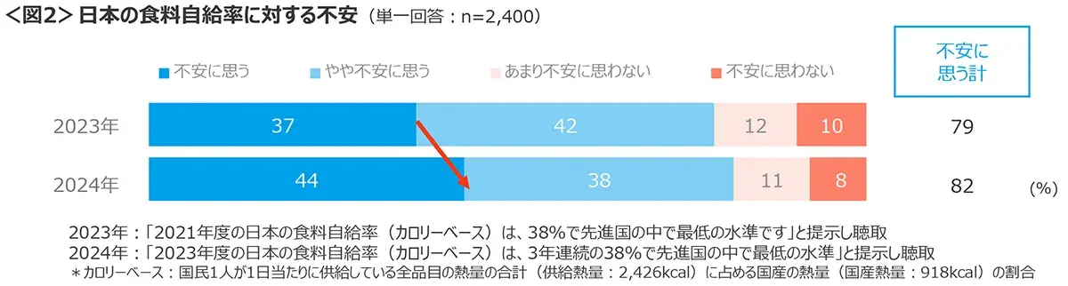 日本の食料自給率への不安について “2023年度の日本の食料自給率(カロリーベース)は、3年連続の38%で先進国の中で最低の水準”を呈示した上で聴取した。「不安に思う」は44%、「やや不安に思う」は38%、合わせて82%が食料自給率に不安をもつ結果となった。今年は店頭からお米が消えたこともあってか、「不安に思う」は、昨年より7ptも上昇した。<図2>