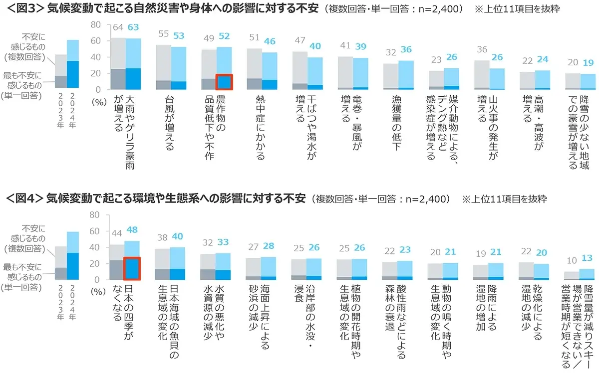 気候変動で起こる自然災害や身体への影響に対する不安は、「大雨やゲリラ豪雨が増える」63%、「台風が増える」53%、「農作物の品質低下や不作」52%、「熱中症にかかる」「干ばつや渇水が増える」が4割台と続く。環境や生態系への影響に対する不安では、「日本の四季がなくなる」48%、「日本海域の魚貝の生息域の変化」40%、「水質の悪化や水資源の減少」が33%と高い。昨年と比べ、猛暑による野菜の高騰の影響から「農作物の品質低下や不作」、長く続く記録的な暑さから「日本の四季がなくなる」において、最も不安に感じる割合が高まっている。<図3・4>