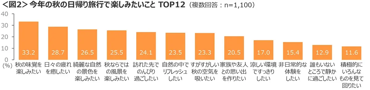 ◆今年の秋の日帰り旅行で楽しみたいことは「秋の味覚を楽しみたい」が33.2%でトップ。<図2>