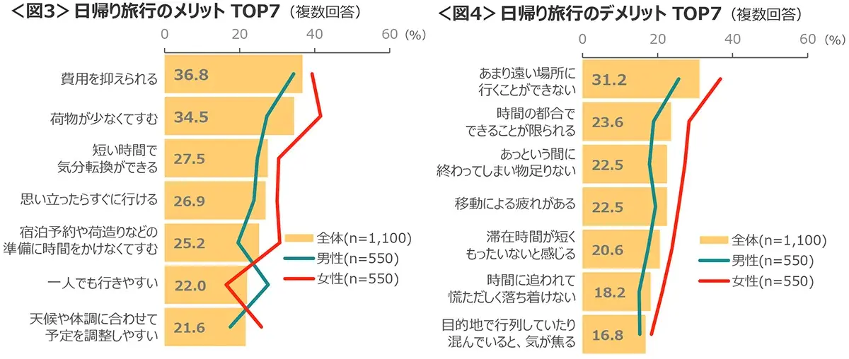 ◆日帰り旅行のメリットは「費用を抑えられる」「荷物が少なくてすむ」が3割台で上位。