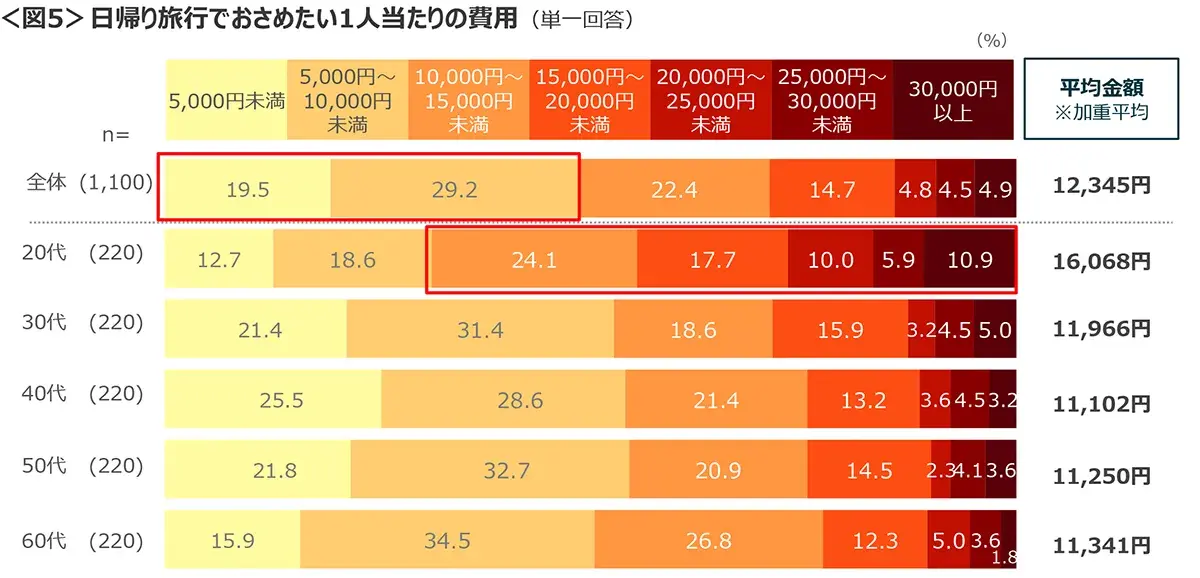 ◆1人当たりの日帰り旅行の費用は、10,000円未満におさめたい人が48.7%。