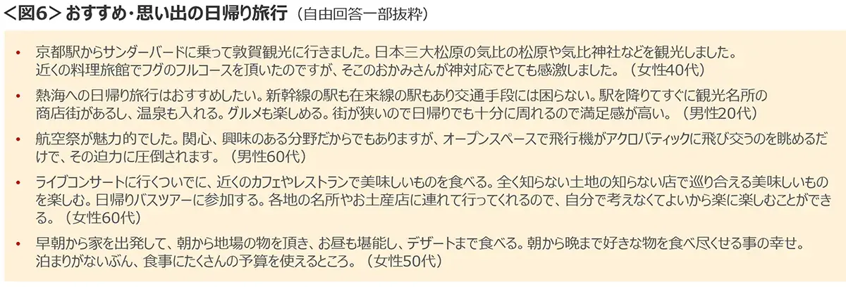 ◆おすすめ・思い出の日帰り旅行では、観光地、イベント、バスツアーへ参加した経験や、「宿泊費用の代わりに食事にお金をかける」など、旅先での過ごし方に関する回答がみられた。<図6>