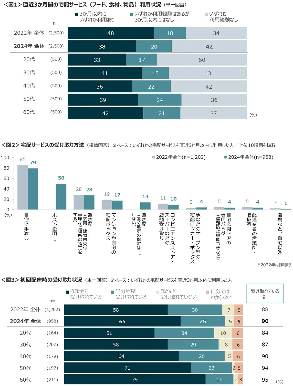 株式会社クロス・マーケティング(本社:東京都新宿区、代表取締役社⻑:五⼗嵐幹)は、2024年9月、全国47都道府県に在住する20~69歳の男女2,500人を対象に「宅配に関する調査(2024年)」を実施し、「宅配」に関わる利用実態や意識・行動などを全般的に聴取しました。今回は、直近3か月以内に宅配サービスを利用した人に対し、受け取り方や再配達を防ぐ方法、物品宅配を利用する理由や不満点・困ったことなどに着目し分析をしました。