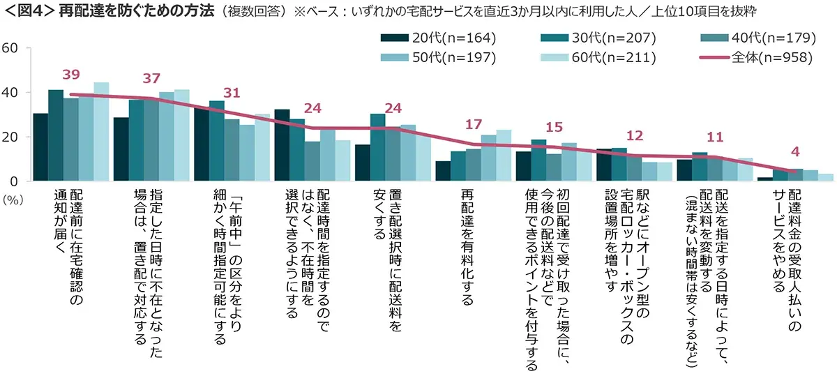 今年の4月にドライバーの時間外労働の上限規制が適用されたこともあり、再配達を防ぐ方法を直近3か月間の利用者に聴取した。「配達前に在宅確認の通知が届く」「指定した日時に不在となった場合は、置き配で対応する」「午前中の区分をより細かく時間指定可能にする」が3割台。20代の「配達時間を指定するのではなく、不在時間を選択できるようにする」と30代の「置き配選択時に配送料を安くする」は他の年代より高い割合であった。<図4>