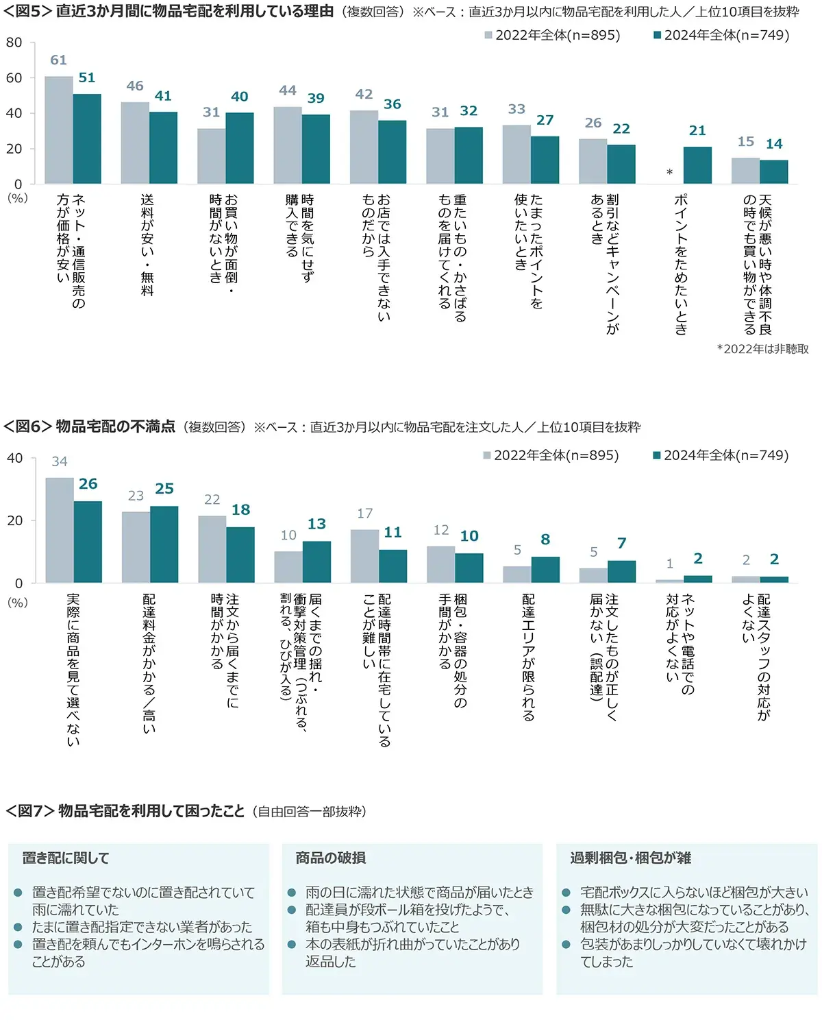 困った点では、「置き配ができない」「置き配希望ではないのに置き配された」「雨の日にぬれた状態で商品が届いた」「宅配ボックスにはいらないほど梱包が大きい」「無駄に大きな梱包で処分が大変」といった声が聞かれた。<図7>