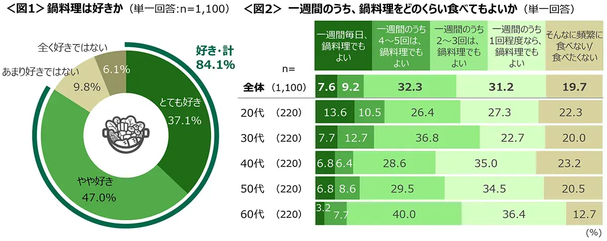 図1 鍋料理は好きか、図2 一週間のうち、鍋料理をどのくらい食べてもよいか
