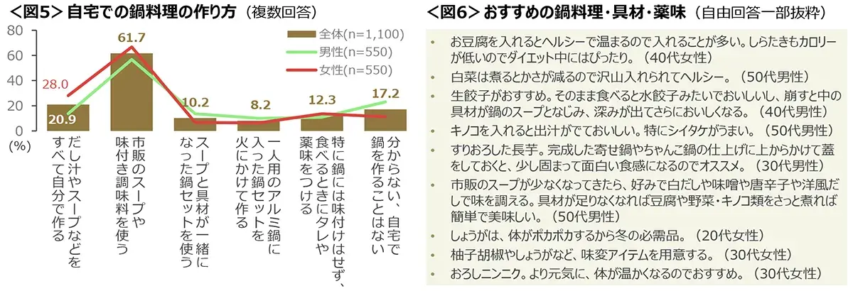 図5 自宅での鍋料理の作り方、図6 おすすめの鍋料理・具材・薬味