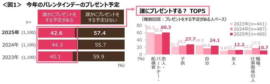 2024年と比べ、「職場、仕事関係の人」が減少し、「恋人・パートナー・配偶者」「子供」「自分」といった身近な人へのプレゼントが増加。<図1>