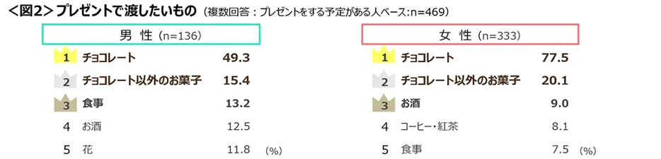 ◆バレンタインデーに渡したいプレゼントは、女性では「チョコレート」が8割と断トツ。