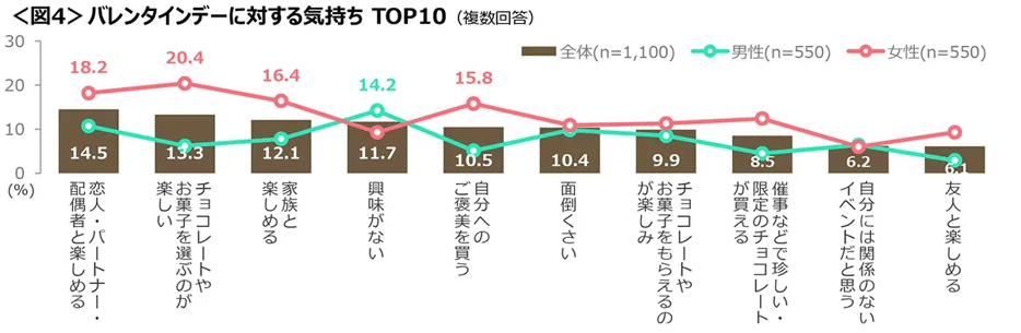 ◆バレンタインデーに対する気持ちは、女性は「チョコレートやお菓子を選ぶのが楽しい」「恋人・パートナー・配偶者と楽しめる」「家族と楽しめる」「自分へのご褒美」、男性は「興味がない」が高く、男女で差がある。<図4>