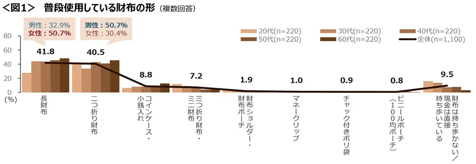 男性は「二つ折り財布」、女性は「長財布」を半数が使用。年代が若くなるにつれて「財布を持ち歩かない」が高い。<図1>