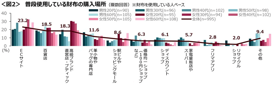 ◆財布の購入場所は「ECサイト」が最も高く、「百貨店」「高級ブランド直営店・ブティック」が続く。