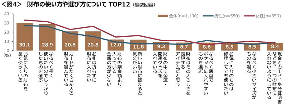 ◆財布の使い方や選び方は、「お気に入りを長く使用」「なるべく長く使いたいのでしっかりしたものを選ぶ」がTOP2で、長く使うことを重視する傾向がうかがえる