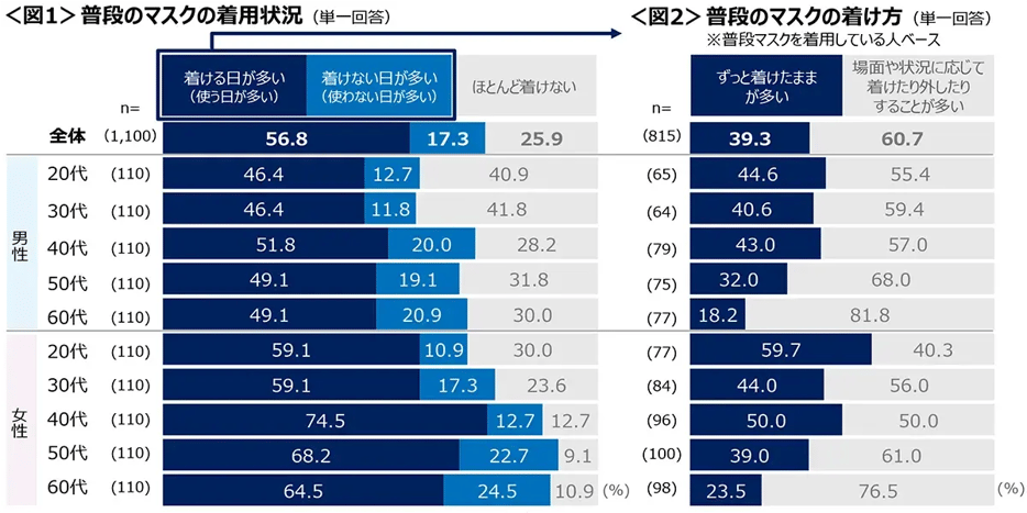 株式会社クロス・マーケティング(本社:東京都新宿区、代表取締役社長:五十嵐 幹)は、全国20歳~69歳の男女を対象に「マスクに関する調査(2025年)」を実施しました。花粉症や風邪・胃腸炎など感染症の対策として、今の季節はマスクを着用している人も多いのではないでしょうか。今回は、「普段のマスクの着用状況」「マスクの着け方」「マスクを選ぶポイント」「マスクをつける場面」「マスク着用に対する意識」について聴取しました。