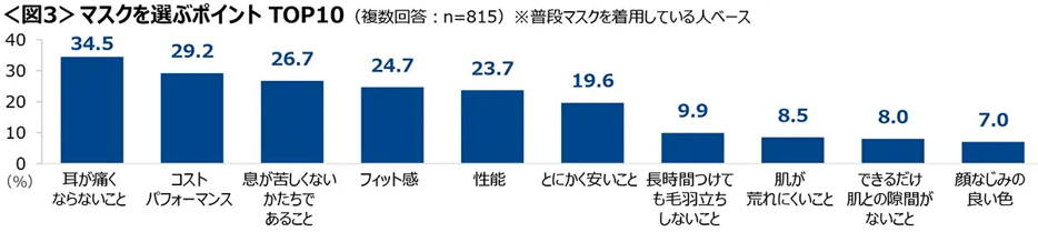 ◆マスクを選ぶポイントは「耳が痛くならないこと」「コストパフォーマンス」「息が苦しくないかたち」がTOP3。<図3>
