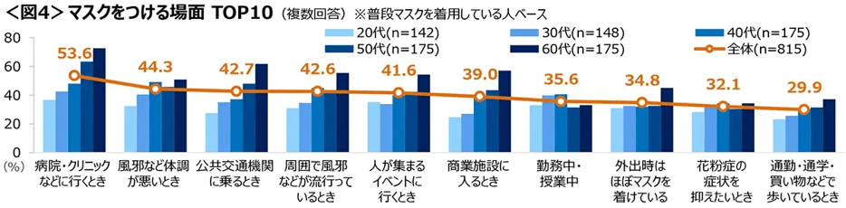 年代が高いほど各場面での着用率は上昇。特に病院や公共交通機関、商業施設などの人が集まる場所で顕著。<図4>