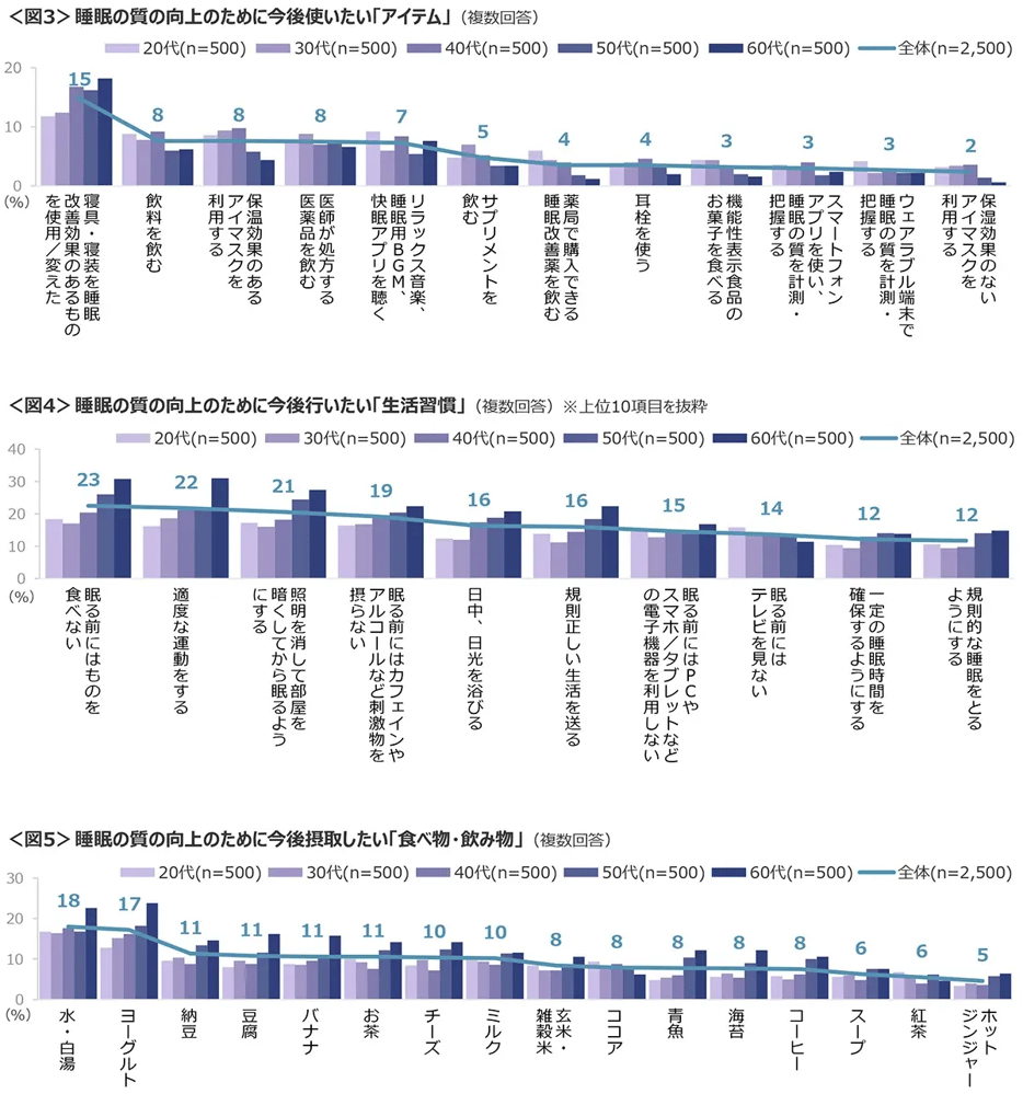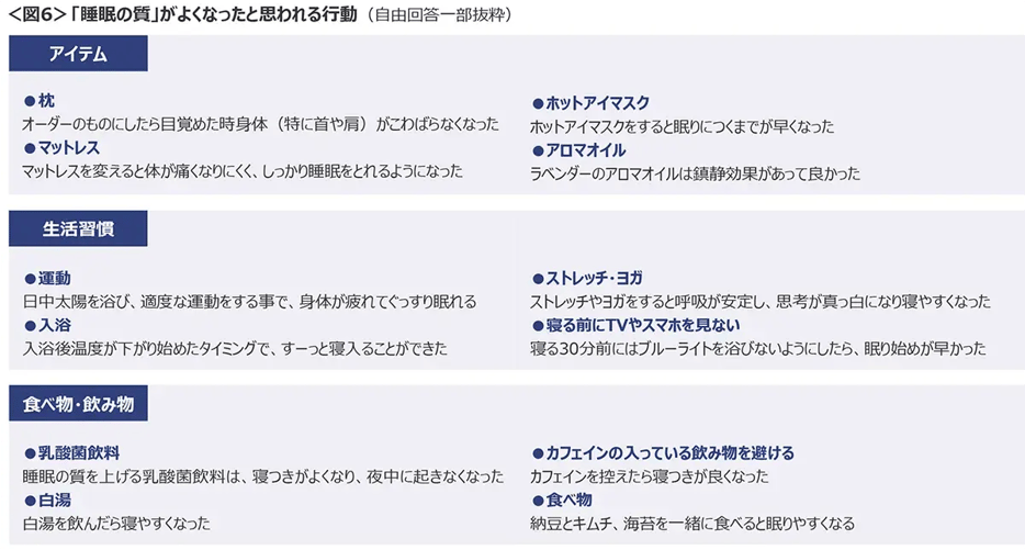 アイテムでは、枕やマットレスを変えることにより、目覚めた時の体こわばりがなくなった/体が痛くなりにくくしっかり睡眠がとれた、ホットアイマスクやアロマオイルを使うことで眠りに早くつける。生活習慣では、適度な運動・ストレッチ・ヨガや入浴後の体温が下がるタイミングで寝ることにより、寝やすくなった。飲み物では、睡眠の質の向上をうたう乳酸菌飲料、白湯、カフェインを控えることによる寝つきの良さや夜中に起きなくなったという声が聞かれた。特に「目覚めのよさ」「寝つきのよさ」への効果を語る意見が多く見られた。<図6>