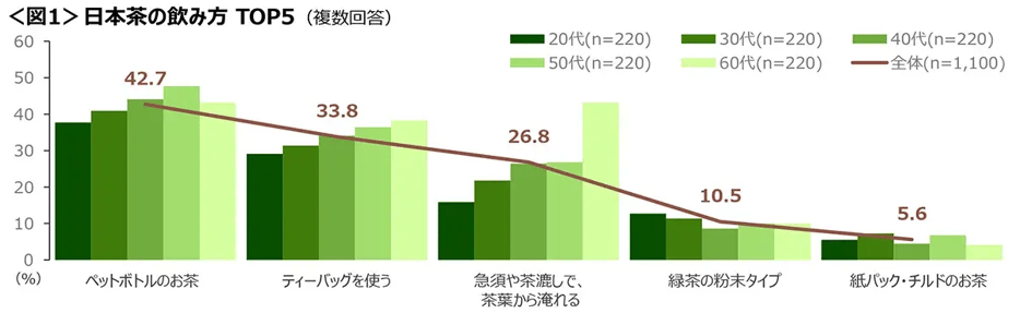◆日本茶の飲み方は、「ペットボトルのお茶」が42.7%と最多、「ティーバッグを使う」が33.8%で続く。