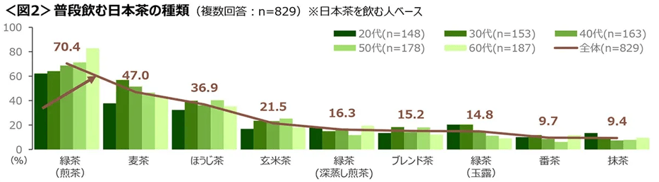 ◆普段飲む日本茶の種類は、「緑茶(煎茶)」が70.4%と断トツ。「麦茶」「ほうじ茶」が3~4割台。