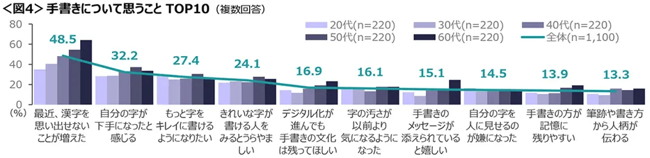 「最近漢字を思い出せない」は、いずれの年代でも1位にあがり、20代では35.0%、60代では64.1%。年代を問わずデジタル化による手書き離れの影響が感じられる。<図4>