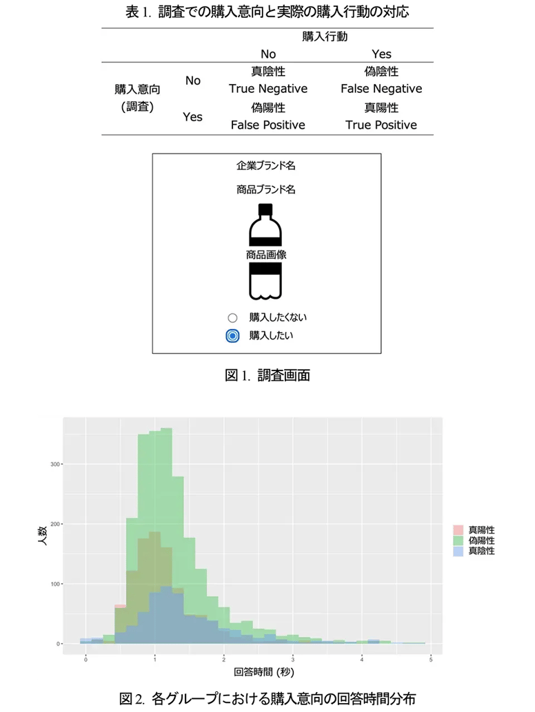 その結果、「調査で購入意向を表明した人のうち、その後実際に購入しない人(偽陽性)」、「調査で購入意向を表明せず、かつその後購入しなかった人(偽陰性)」よりも、「調査で購入意向を表明し、その後実際に購入する人(真陽性)」の方が速い回答になることが確認されました。