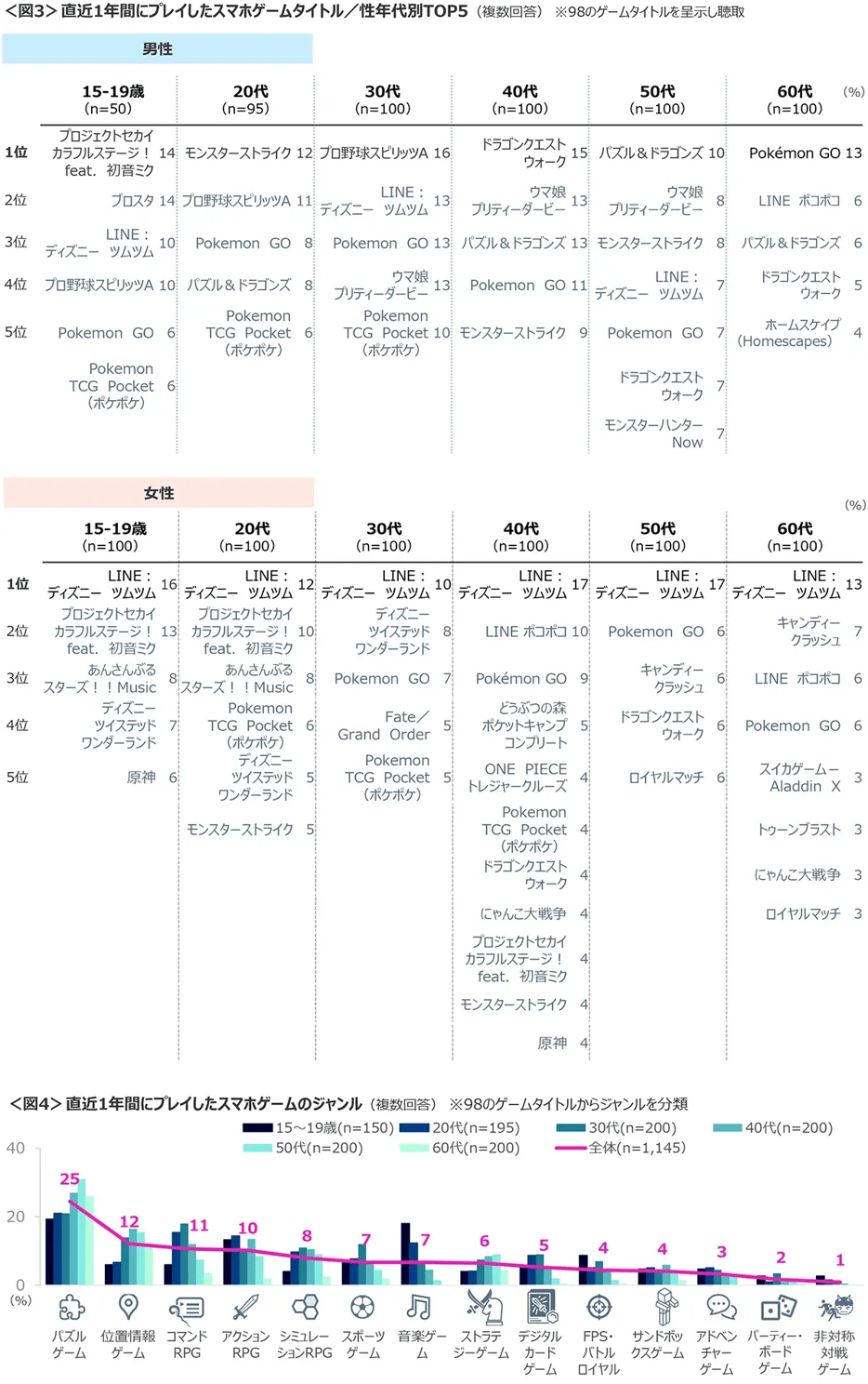 直近1年間にプレイしたゲームタイトルを聴取した。男性のTOPは、年代別に異なるタイトルがあがった。女性は全世代で「LINE:ディズニーツムツム」がTOP。男性15~19歳と女性15~19歳、20代は「プロジェクトセカイ カラフルステージ! feat. 初音ミク(プロセカ)」が1、2位を占めた。リリースから1年未満の「Pokemon TCG Pocket(ポケポケ)」は、男性15~19歳、20~30代、女性20~40代で、4~5位をキープしている。<図3>