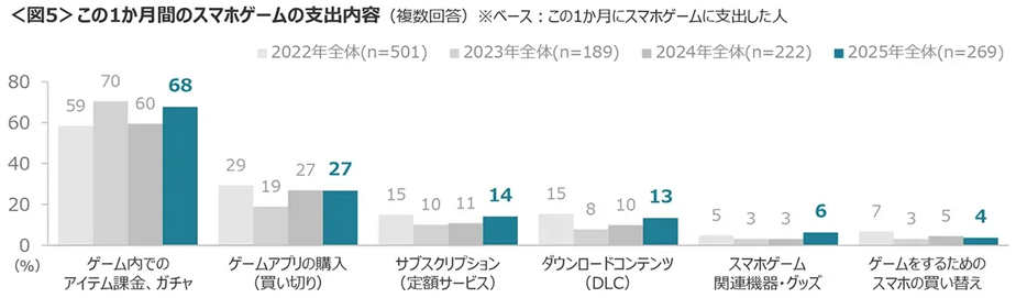 この1か月の間にスマホゲームにお金を使った人の具体的な支出内容は、「ゲーム内でのアイテム課金、ガチャ」が68%が最も多く、次いで「ゲームアプリの購入(買い切り)」27%。<図5>