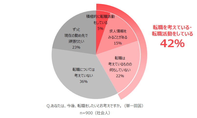 - 社会人の42%は「転職を検討」、しかし実際に転職活動をしている人はわずか5%で、考えていても行動に移せていない人が多い。
