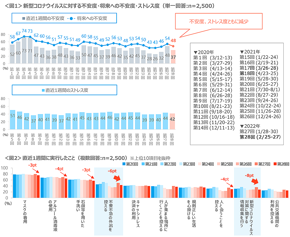 新型コロナウイルスが消費者の行動や意識に与える影響の把握を目的として、全国47都道府県に在住する20〜69歳の男女2,500人を対象に「新型コロナウイルス生活影響度調査」を第1回(2020年3月12日〜13日)から定期的に実施。2022年2月の第28回は、第6波のピークアウトが2月中旬に見てとれるようになった2月25日〜27日に調査を行い、人々の意識・行動について分析しました。 - ピークアウトが見え、感染症予防対策は減少へ