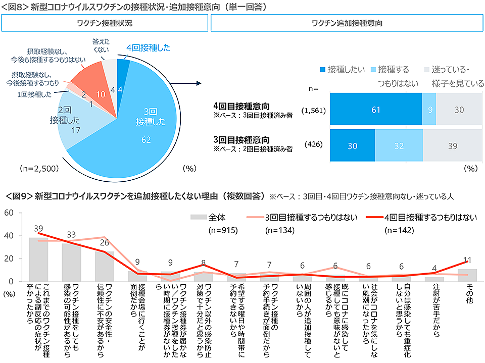 「接種するつもりはない」と回答した人に理由を尋ねたところ、「副反応が辛かった」「接種をしていても感染の可能性がある」「安全性・信頼に不安」が多かった。3回目の接種意向がない人では「安全性・信頼に不安」が一番手の理由にあがっている。<図9>
