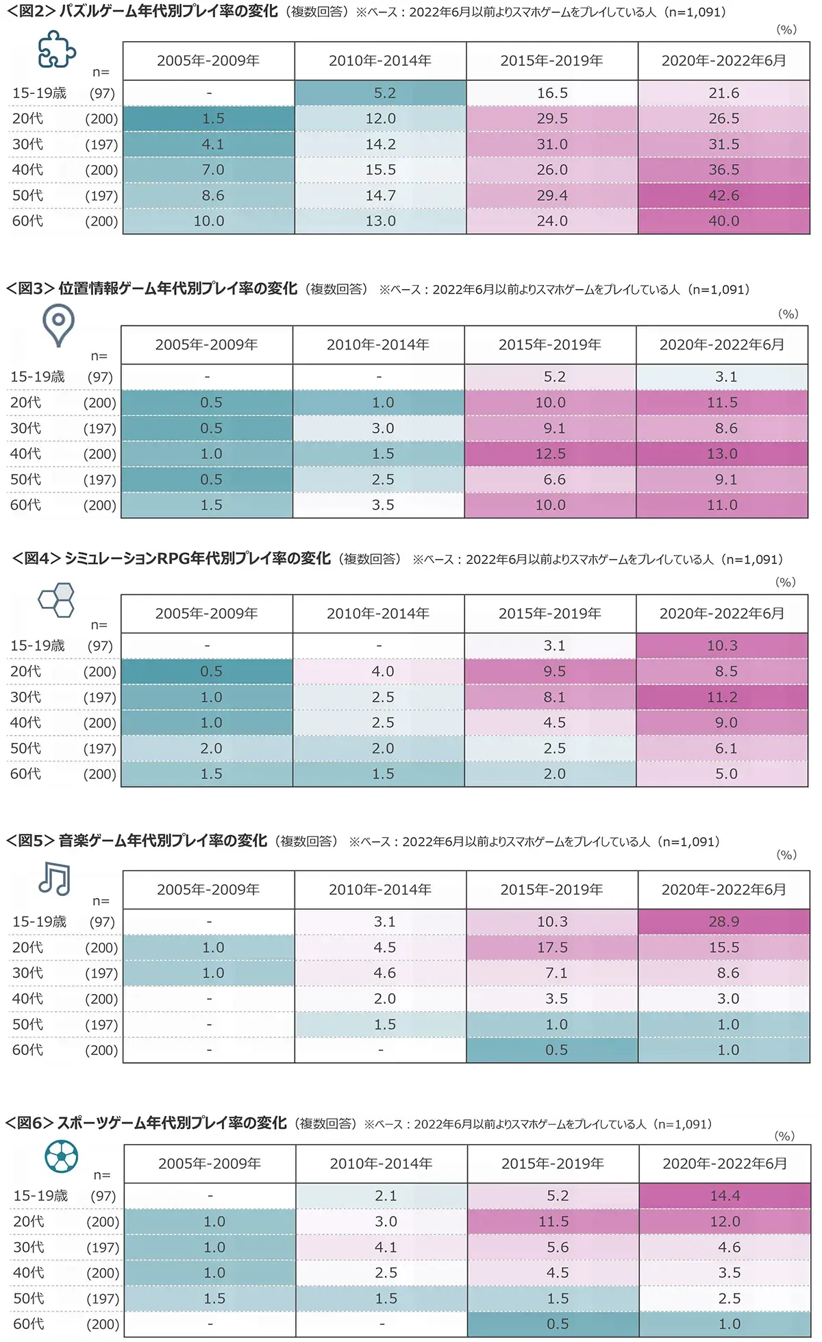 プレイ率TOP5のジャンルについて、年代別のプレイ率の変化を確認した。スマートフォンの普及が拡大していた2015年から「パズルゲーム」のプレイ率は上昇している。若年層から高年層まで全世代でのプレイ率が高めであり、特に50〜60代の2020年〜2022年6月のプレイ率は4割を超える。<図2>
