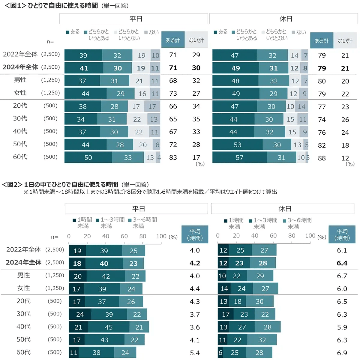 コロナ禍の2年前の調査結果と比べ、ひとりで自由に使える時間の有無や平均時間に大きな変化は見られなかった。