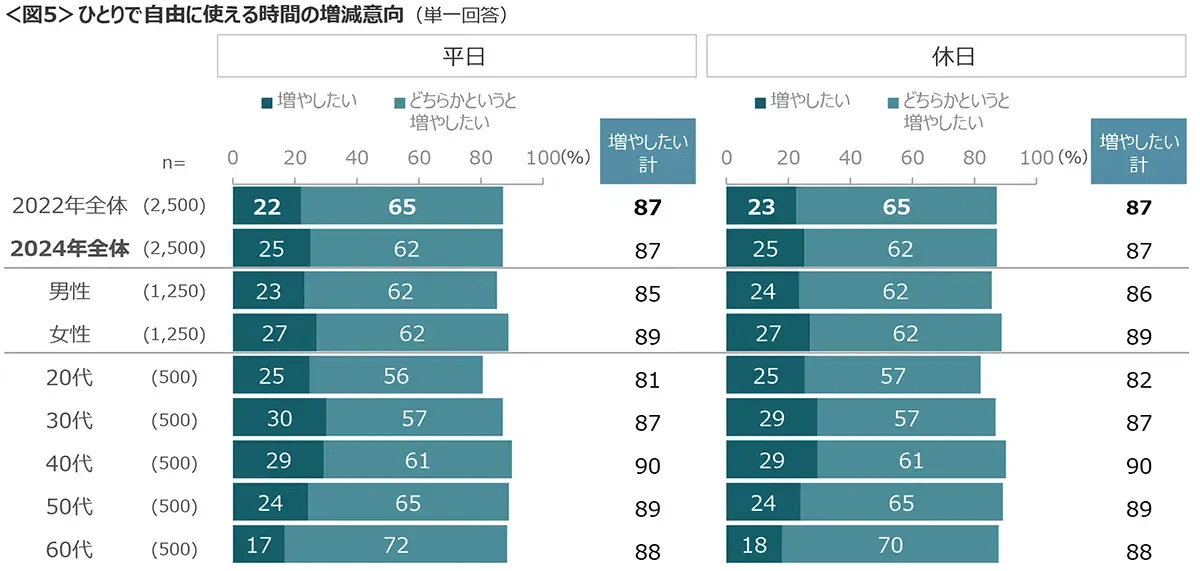 ひとりで自由に使える時間の増減意向は、「増やしたい+どちらかというと増やしたい」は平日も休日も87%と2年前と同様な結果であった。ひとり時間を増やしたい意向が強いのは、家事や育児に時間のとられる女性や40~50代であった。<図5>