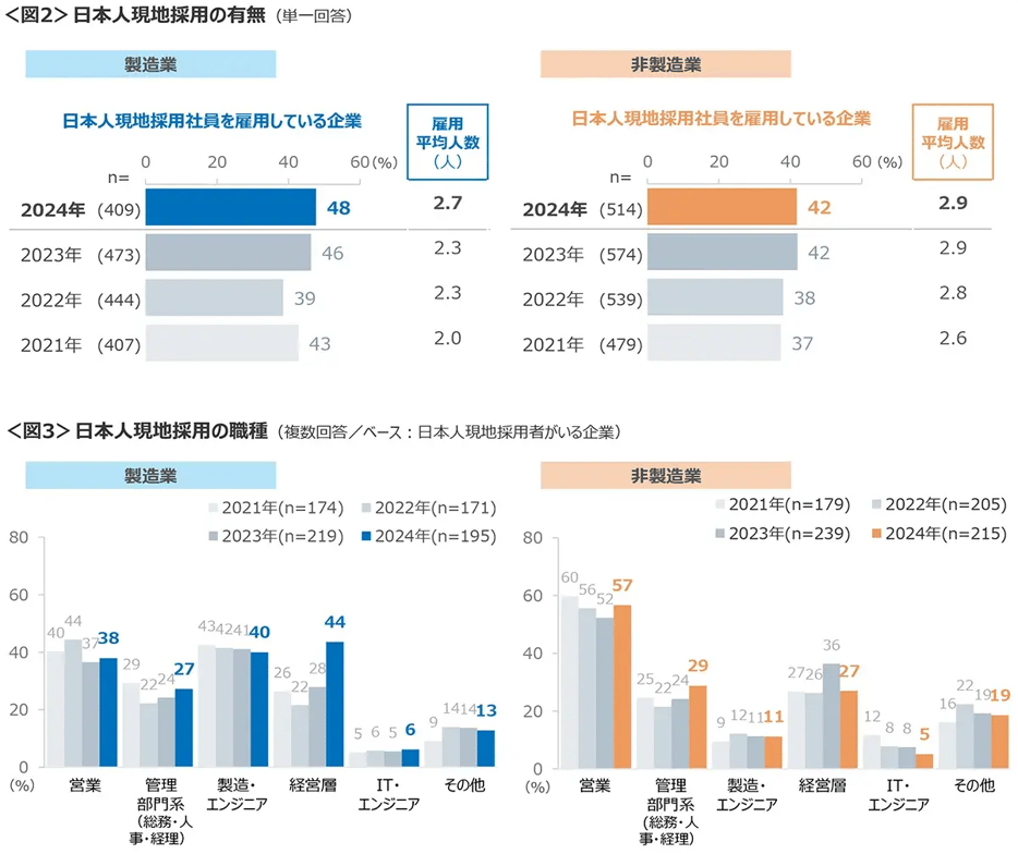 日本人現地採用社員を雇用している企業は、製造業で48%、非製造業で42%となっており、昨年から大きな変わりはない。雇用平均人数は、製造業において昨年の2.3人から2.7人へと微増、非製造業は2.9人と同様ではあるが、日本人駐在員の人数を減らす代わりに日本人現地採用をする動きが見てとれる。<図2>職種については製造業の「経営層」が昨年の28%から44%と16ptと大きく上昇。管理職クラスの人材の需要がさらに高まっていくことが考えられる。 <図3>