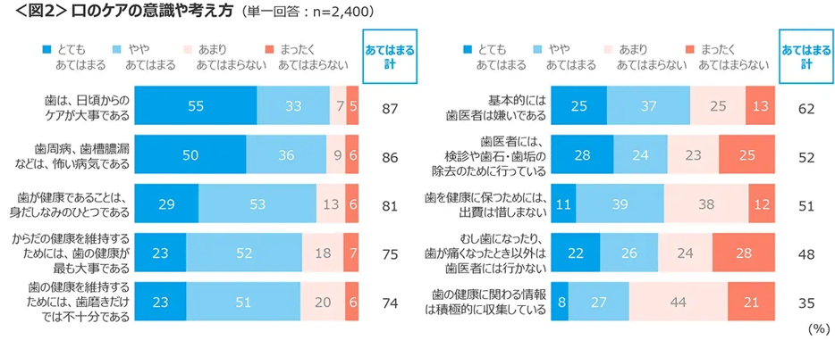 3口腔ケアに対する意識や考え方を10項目呈示し確認をした。とても+ややあてはまる割合は「歯は、日頃からのケアが大事」87%、「歯周病、歯槽膿漏などは、怖い病気」86%、「歯が健康であることは、身だしなみのひとつ」81%、「からだの健康を維持するためには、歯の健康が最も大事」75%、「歯の健康を維持するためには、歯磨きだけでは不十分」74%が上位であった。<図2>