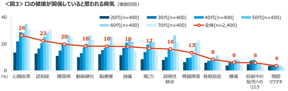 口の健康と関係のある病気 心臓疾患、認知症、糖尿病は2割台にとどまる - ー 口に関する調査(2025年) ー