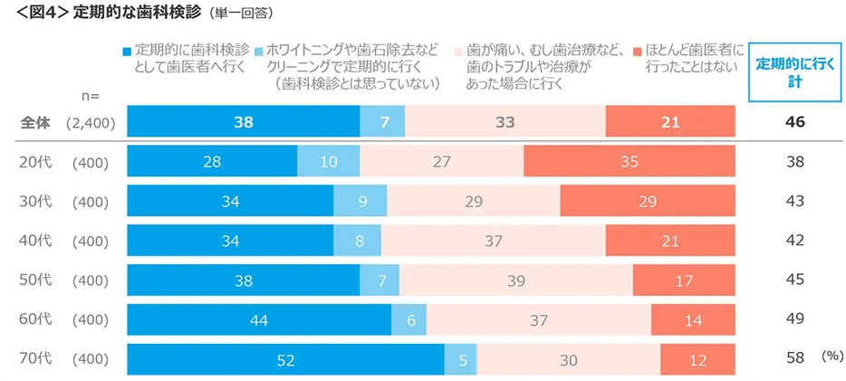 歯科検診やホワイトニング・歯石除去など「定期的に歯科医へ行く」は46%、「トラブルや治療があった場合に行く」が33%。年齢が上がるほど割合は高まる傾向にある。20代は、定期検診に行くと行かないが拮抗。<図4>