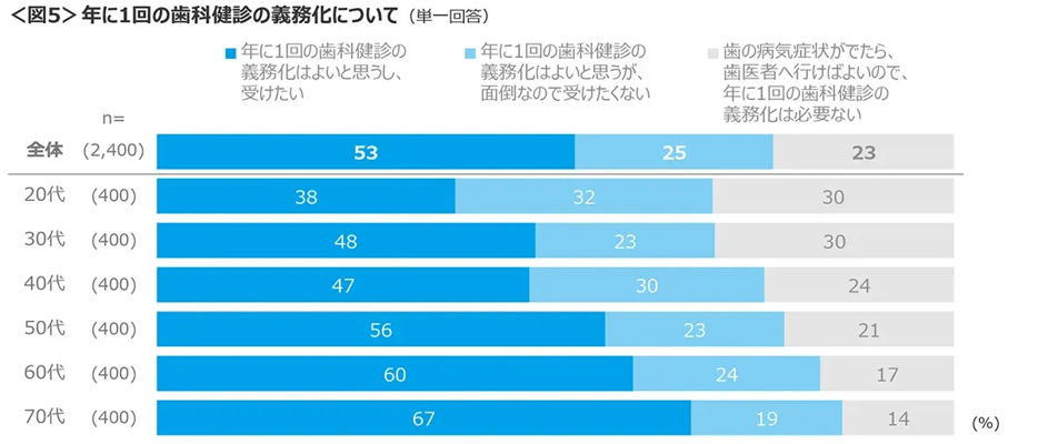 2025年2月、全国20~79歳の男女2,400名を対象に「口に関する調査(2025年)」を行いました。日本は、治療のために歯科医院を受診するケースが多く、予防歯科の意識が低いといわれています。また、歯の健康はからだ全身の健康と関係があるため、厚生労働省と日本歯科医師会が8020運動を1989年より推進しています。今回は、口について気になること、口腔ケアに対する意識、口の健康とからだの病気、定期的な歯科検診などに注目し分析をしました。- 歯科健診の義務化を「よいと思うし受けたい」は53%
