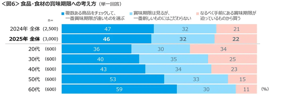 食品や食材への賞味期限に対し、「複数ある商品をチェックして、一番賞味期限が遠いものを選ぶ」は46%で、年代が上がるほど高まり50~60代は半数超え。20代のみ「一番新しいものにはこだわらない」よりも「賞味期限が迫っている物から買う」の割合が多い。<図6>