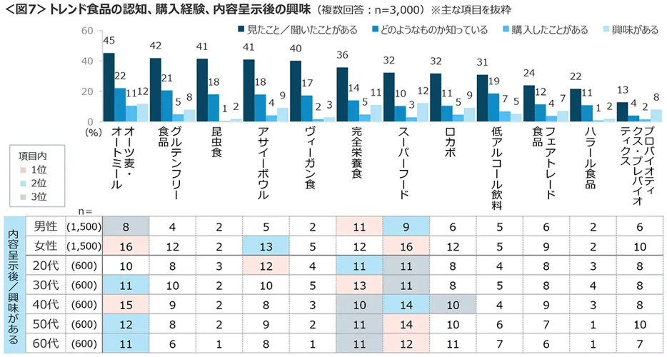 様々な食品のうち、見たこと/聞いたことがあるのは「オーツ麦・オートミール」「グルテンフリー食品」「昆虫食」「アサイーボウル」「ヴィーガン食」が4割台。購入経験があるのは「オーツ麦・オートミール」が11%で他の商品は1割に満たない。 どのような食品か内容を呈示したあとの興味は、「スーパーフード」「オーツ麦・オートミール」12%、「完全栄養食」11%。男性は「完全栄養食」、女性は「オーツ麦・オートミール」「スーパーフード」 の興味が高い。<図7>