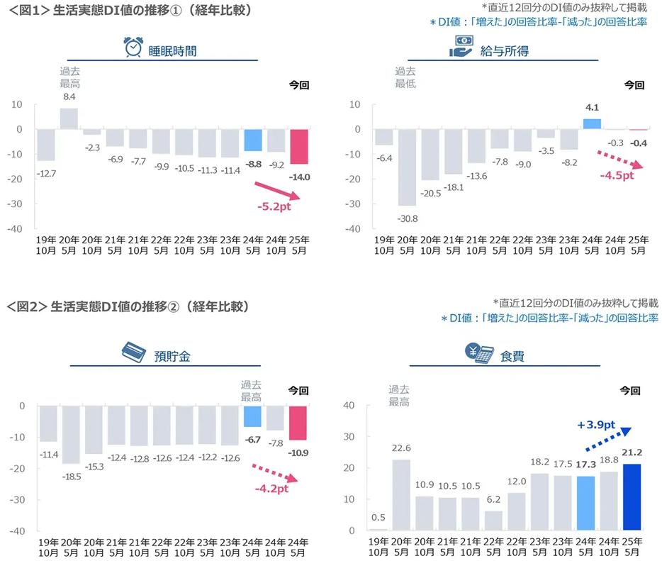 生活実態DI値「睡眠時間」は5ptの減少、「給与所得」は上昇から低下に転じ、「預貯金」も低下。「食費」のみ4pt上昇。給与所得が物価高に追いつかず、先立つ食費のため貯蓄へ回す余裕のない様子がみてとれる。<図1、2>