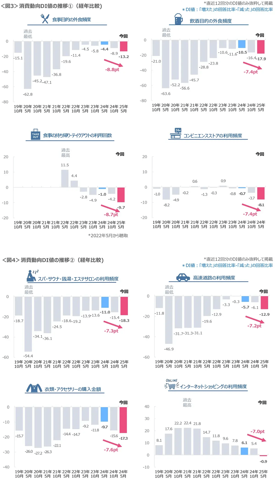 消費動向については、食材が高くなりメニューの値上げが進んだことから「食事目的の外食頻度」「飲食目的の外食頻度」「食事のテイクアウト回数」が軒並み7~9ptの低下。「コンビニエンスストア」「スパ・サウナ・銭湯・エステサロン」「高速道路」「インターネット」の利用頻度や「衣類・アクセサリーの購入金額」も7~8ptの低下。本調査で聴取しているその他の消費動向で上昇している項目はなく、実質賃金が上がらず消費行動が縮小しているとみられる。<図3、4>