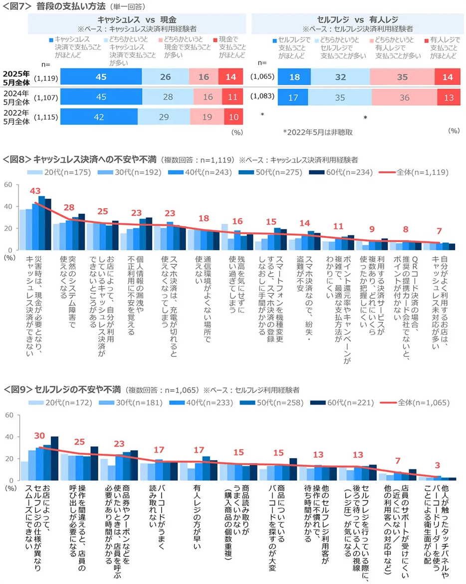 セルフレジに対しては「お店によりセルフレジの仕様が異なりスムーズにできない」「操作を間違えると店員の呼び出しが必要」「商品券やクーポン利用時は店員の呼び出しが必要で時間がかかる」といった不満が上位にあがり、いずれも60代で高い。<図9>