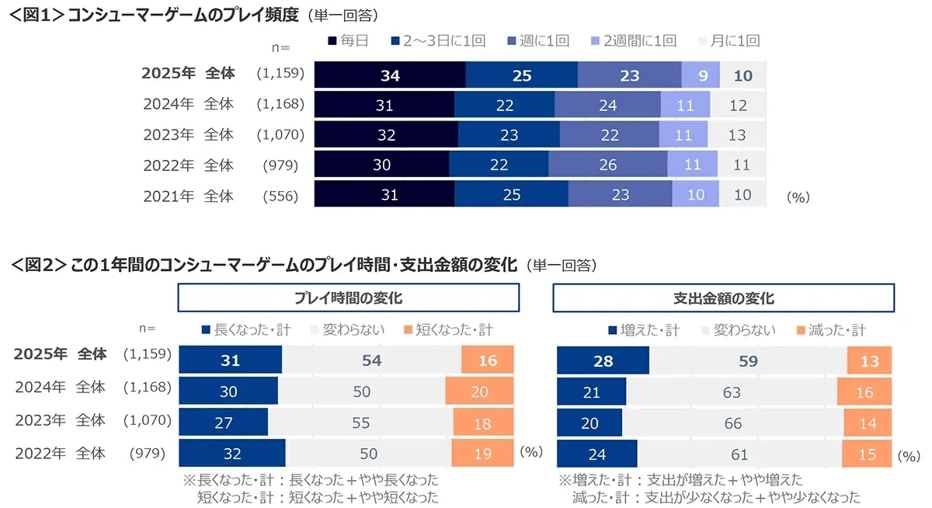 2025年6~7月、コンシューマーゲームを月1回以上プレイしている全国15~69歳の男女1,159名を対象に「ゲームに関する調査(2025年)コンシューマーゲーム編」を行いました。今回は、プレイ頻度、1年前と比較したプレイ時間・支出金額、プレイしているゲームタイトルとジャンル、支払ったゲーム関連費、ゲームの購入媒体に注目し、分析をしました。◆スマホゲーム編はこちら