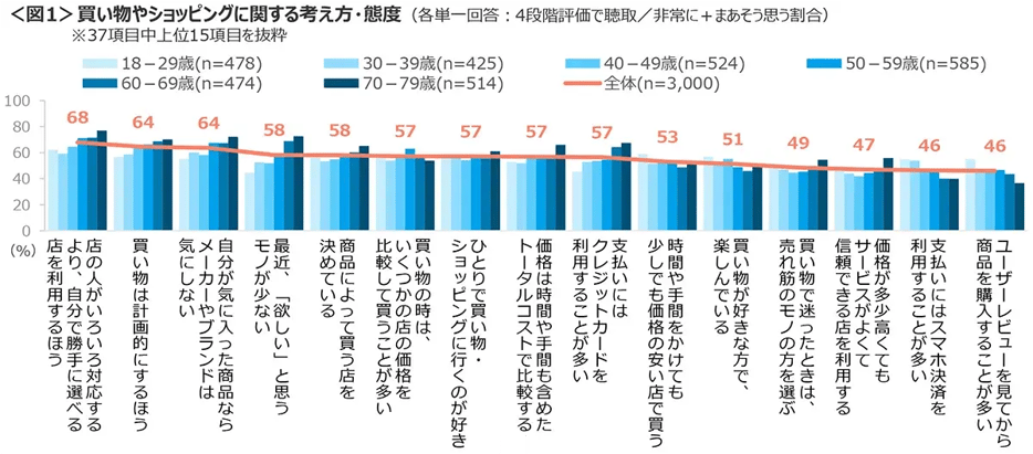 買い物やショッピング行動についての考え方・態度を4段階で聴取した。非常に+まあそう思う割合は、「店の人がいろいろ対応するより、自分で勝手に選べる店を利用する」「買い物は計画的にする」「自分が気に入った商品ならメーカーやブランドは気にしない」「最近、欲しいと思うモノが少ない」「商品によって買う店を決めている」が上位で、年代が上がるほど割合が増える傾向にある。一方、若年層ほど高まる傾向にあるのは「支払いにはスマホ決済を利用することが多い」「ユーザーレビューを見てから商品を購入することが多い」。<図1>