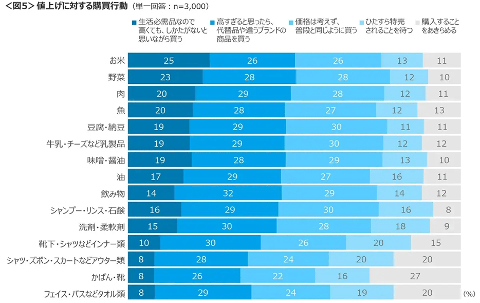 値上げが続く中、買う際にどのような感想を持つかを15種類のジャンルで確認した。「生活必需品なので高くても、しかたないと思いながら買う」は、お米、野菜、肉、魚など日頃欠かせない食品。「高すぎると思ったら、代替品や違うブランドの商品を買う」が高いのは、飲み物、洗剤・柔軟剤、靴下・シャツなどインナー類。「価格は考えず、普段と同じように買う」は豆腐・納豆、牛乳・チーズなど乳製品、シャンプー・リンス・石鹸であり、お店により大きな価格差の少ないものがあがった。<図5>