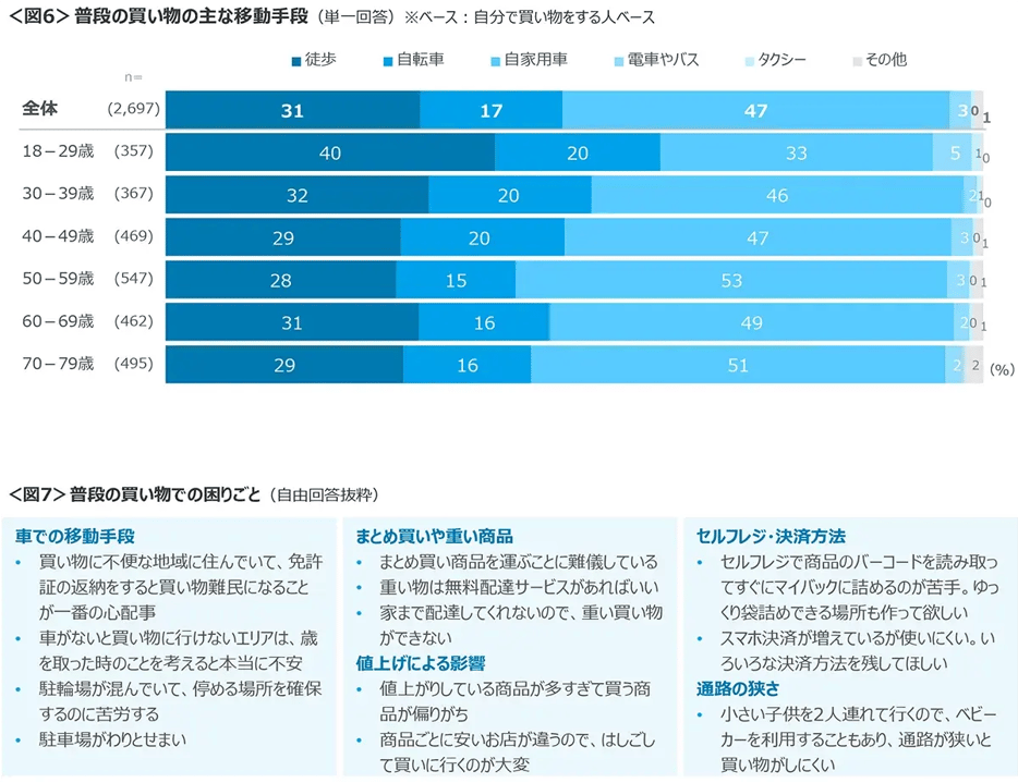買い物での困りごととして、高齢になると買い物に必要不可欠な車が運転できなくなることへの心配・不安、まとめ買いや重い商品を運ぶことの大変さ、セルフレジでゆっくり袋詰めできない、ベビーカー利用での通路の狭さ、駐車場の少なさや混雑さなどの声があがった。<図7>