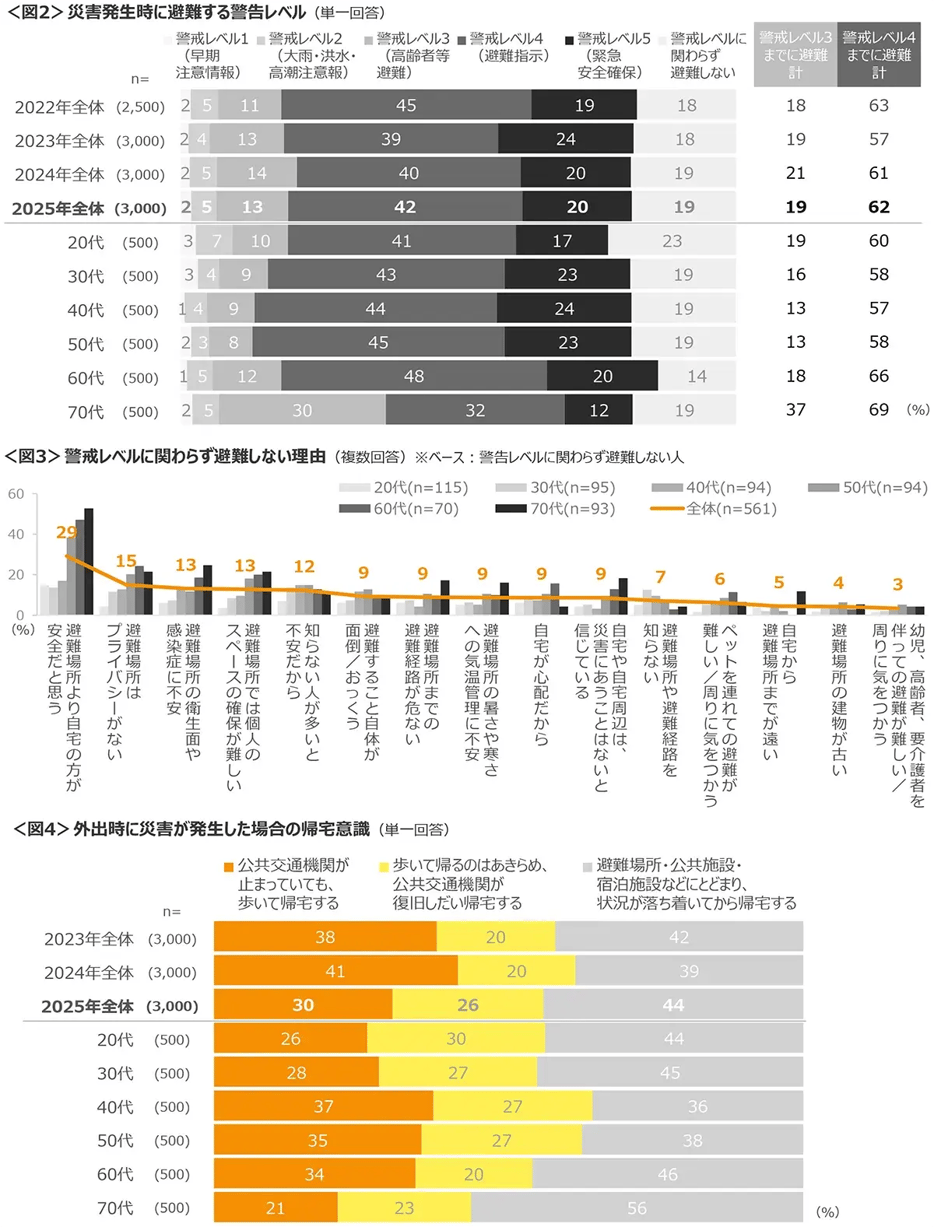 2025年7月、全国20~79歳の男女3,000名を対象に「防災に関する調査(2025年)意識編」を行いました。今年はすでに世界各地で地震、山火事、洪水といった自然災害が発生しています。今回は、避難場所・避難所の認識、避難する警告レベルと避難しない理由、災害発生時の帰宅意識、不安に思う自然災害、防災の必要性、他地域で自然災害が起きた場合の考え方や気持ちについて分析をしました。◆備え・実践編はこちら