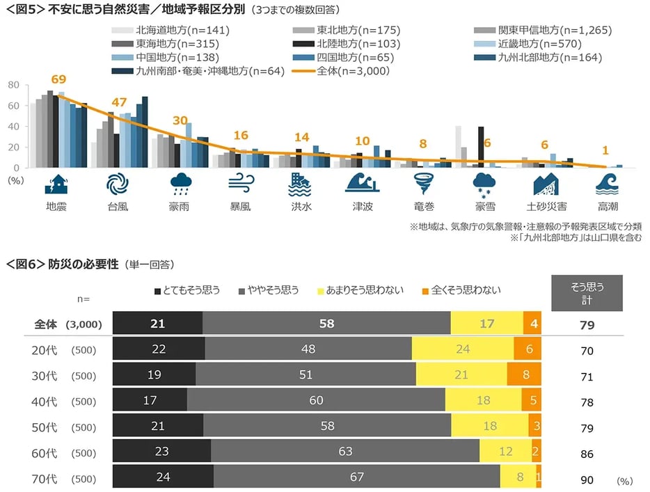 不安に思う自然災害を3つまで聴取し、「地震」69%、「台風」47%、「豪雨」30%がTOP3。地域予報区分別には、九州北部地方と九州南部・奄美・沖縄地方の「台風」への不安が高い。「豪雨」は、過去に災害が発生している中国地方で44%と高い。<図5>